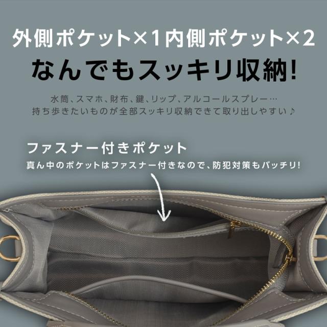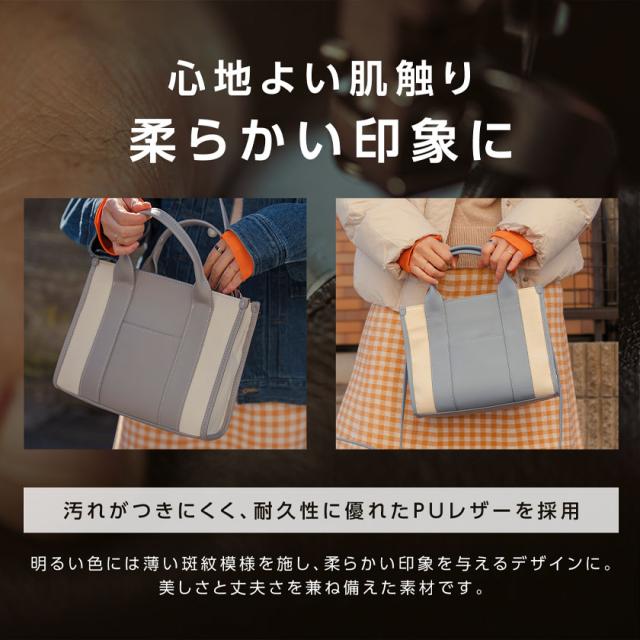 ・【心地よい肌触り「PUレザー」】明るい色には薄い斑紋模様を施し、柔らかい印象を与えるデザインに。美しさと丈夫さを兼ね備えた素材です。・【仕切りも収納スペース可!】水筒、スマホ、財布、鍵、リップ、アルコールスプレー…持ち歩きたいものが全部スッキリ収納できて取り出しやすい♪