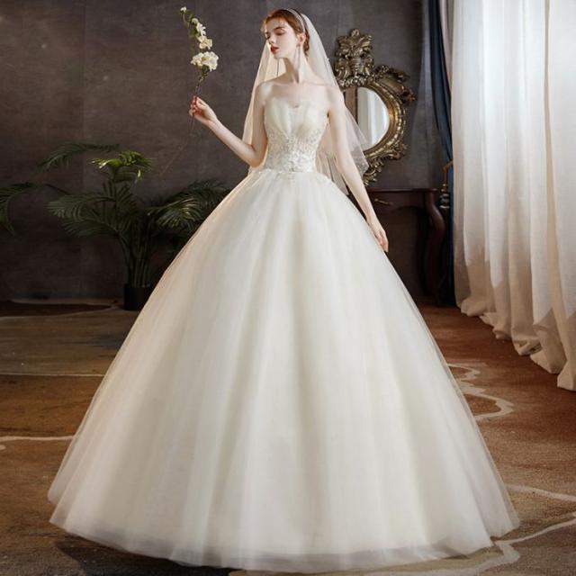 ウェディングドレス ワンショルダーネック 花柄 可愛い 花嫁 フランス風 ロングドレス プリンセスドレス ビーズ おしゃれ お嫁さん 結婚式 編み上げ プリンセスライン