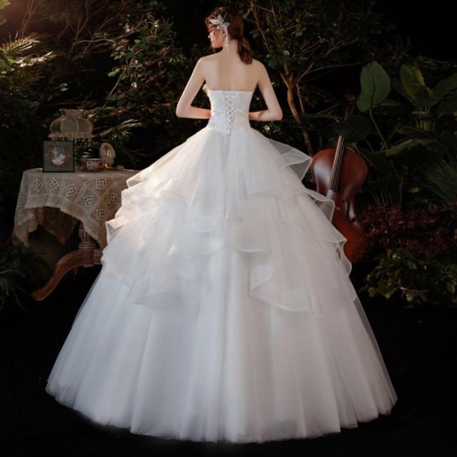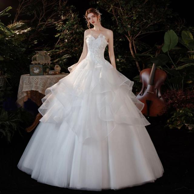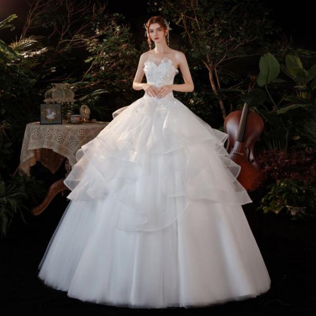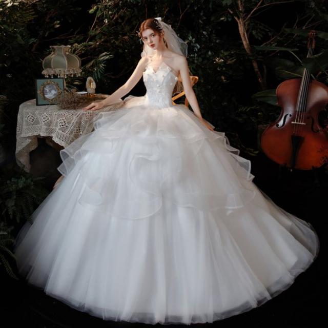 ウェディングドレス ハートカットネック 花柄 可愛い 花嫁 ナチュラル エレガント ロングドレス プリンセスドレス 白色 おしゃれ お嫁さん 結婚式 編み上げ プリンセスライン