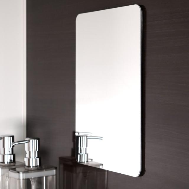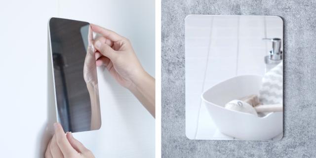 ●浴室でも快適に使えるくもり止め加工を施した粘着テープで貼り付けるタイプのミラーです。