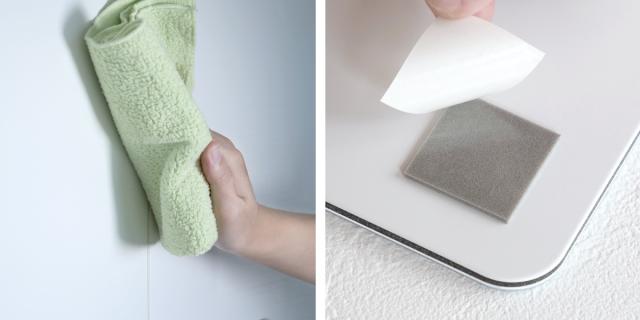 | 1・取り付け壁面を綺麗にする 取り付ける壁面の汚れ、水分、油分を拭き取り、良く乾かして下さい。吸盤も綺麗に拭き、乾かします。 | 2・剥離紙を剥がす 鏡裏面の粘着テープ(4か所)の剥離紙をはがしてください。 |