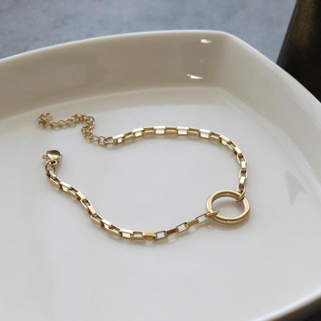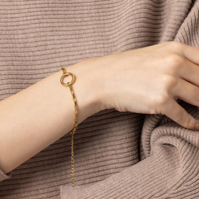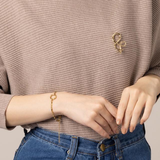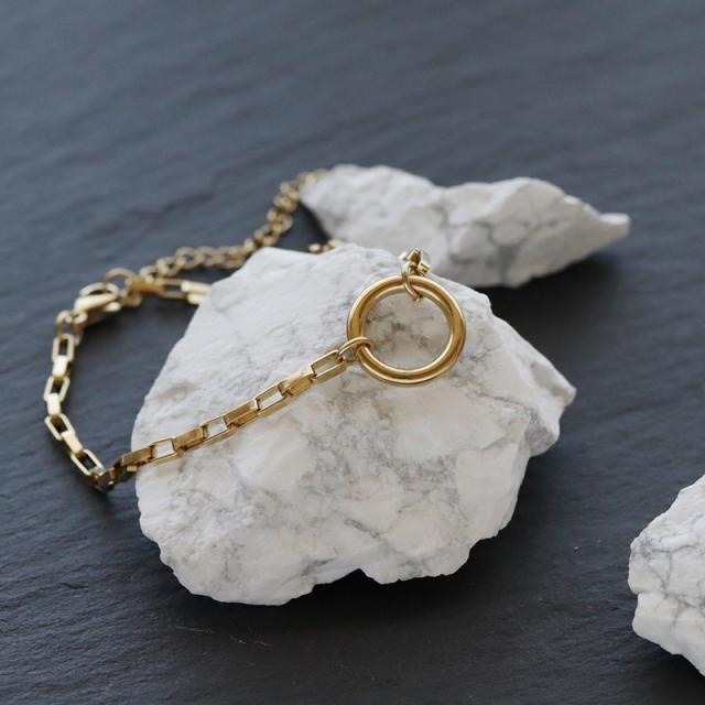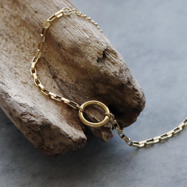 手元にアクセントを与えてくれるスクエアチェーンにリングモチーフを合わせたブレスレットです。