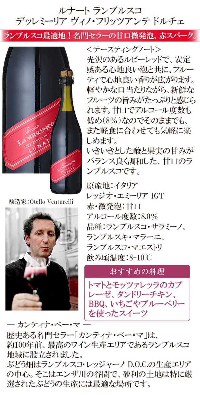 歴史ある名門セラー 赤微発泡 甘口 ルナート ランブルスコ デッレミーリア ヴィノ・フリッツアンテ ドルチェ 赤 スパークリング ワイン イタリアワイン イタリア ランブルスコ ワイン 泡 微発泡