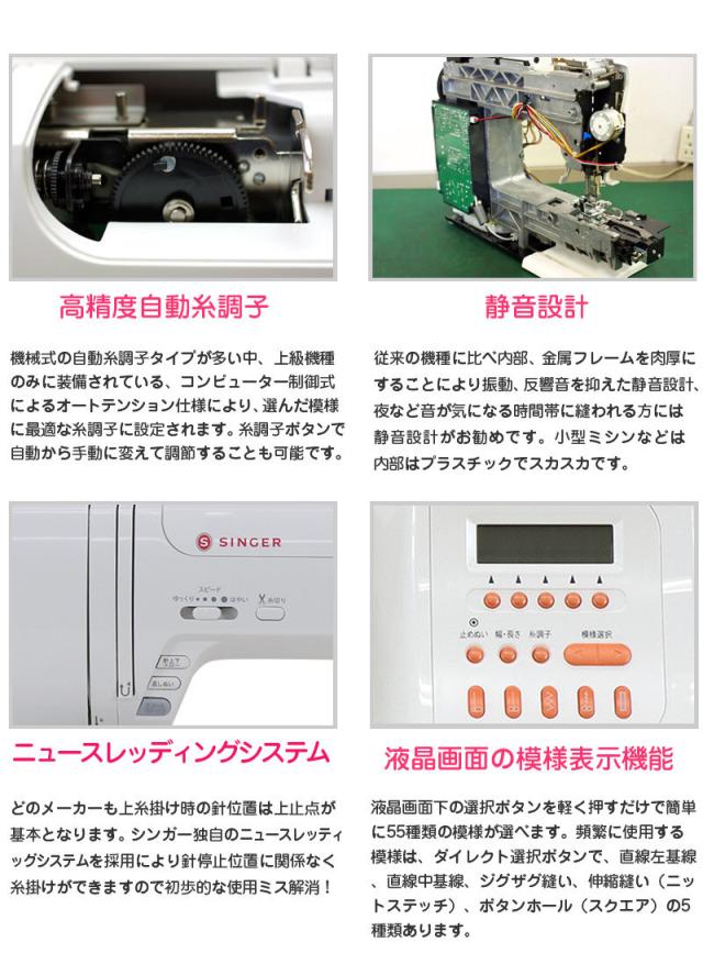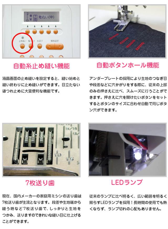 自動糸調子仕様、液晶模様表示仕様、縫い模様数260種類、文字縫いステッチ縫い機能、ニュースレッティッグシステム、下糸巻き自動停止機能、自動針穴通し(自動糸通し)、自動糸切り機能(オートカッター)、自動糸止め縫い機能(ほつれ止め)、光る手元スタート/ストップボタン、ワンタッチスローボタン、自動ボタンホール(アンダープレート付き、自動穴かがり縫い)、7枚送り歯、貫通力(縫うパワー)、LEDランプ、オール金属製針板、広いソーイングスペース、ハードケース付属(硬質収納ケース)、電源コード巻き込み式、静音設計、ワイドテーブルサービス、フットコントローラーサービス、付属品一式