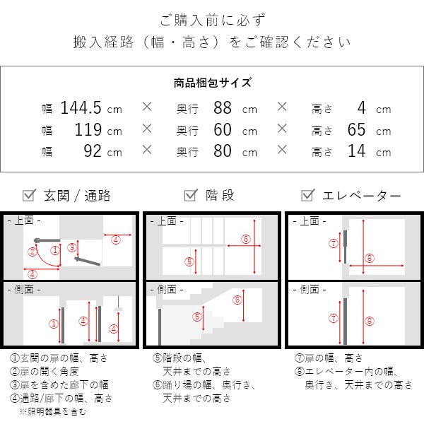 | その他 | 梱包サイズ: 約 幅144.5cm x 奥行88cm x 高さ4cm 約 幅119cm x 奥行60cm x 高さ65cm 約 幅92cm x 奥行80cm x 高さ14cm 梱包重量:約33kg 個口数:3個 組立品 生産国:中国 |