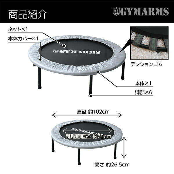| 商品説明 | ●手軽に運動ができるトランポリン ●安全で丈夫なテンションゴム採用 ●折りたたんでコンパクトに収納 ●収納時サイズ:幅68.5×奥行33.5×高さ8.5cm ●使用体重制限:最大100kg ※折りたたみ、組立は2人以上で行ってください ※本製品は家庭用となります。施設などではご使用を控えてください。不特定多数の人が使用する環境での故障や損傷は保証対象外となります。 |