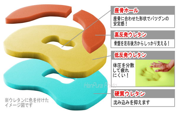 高反発で骨盤を左右後方からしっかり支え低反発で体圧を分散させながらゆっくりと沈み込み、硬質ウレタンは低反発による過度な沈み込みを抑えることで骨盤と姿勢を安定させ腰痛や座り疲れの軽減に導きます。さらに座骨が最も圧迫される部分に座骨の形状を考慮した穴を設けることで座骨への負担を軽減しました。座骨を包み込むように支えることで骨盤や腰への負担を軽減し開き気味の座骨を引き締め安定させ正しい位置へと導きます。また7度の傾斜をつけることで前傾姿勢になり自然と背筋が伸び腰・肩への負担をやわらげます。そうすることにより長時間座っても疲れにくく美しい姿勢を保つことができます。ふんわりタッチのパイル地カバーは取り外して洗濯可能、裏面にはスベリ止め加工!■サイズ約縦310×横420×高さ85mm/重量約300g/材質[中身]ポリウレタンフォーム[カバー](パイル地)綿80%、ポリエステル20%(編地)ポリエステル100%■カラー:レッド/生産国:中国製