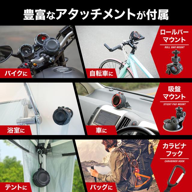 | 「シャワー室などの壁面」「バイクや自転車のハンドル」に付けられる2種のアタッチメントプラス、カラビナフックも付属しました。 |