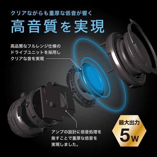 | 最大出力5Wでクリアな音が出る高品質ドライブユニットを採用し、アンプの低音処理設計で重厚な低音が響く幅広くバランスの良い高音質を実現しました。 |