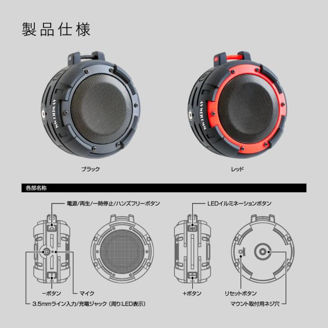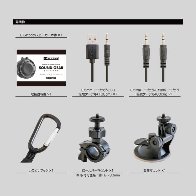 | 付属品 | ・3.5mmミニプラグ-USB 充電ケーブル(100cm) ・3.5mmミニプラグ-3.5mmミニプラグ 接続ケーブル(60cm) ・ロールバーマウント※取付可能経:約18〜30mm ・吸盤マウント ・取扱説明書(保証書付) |