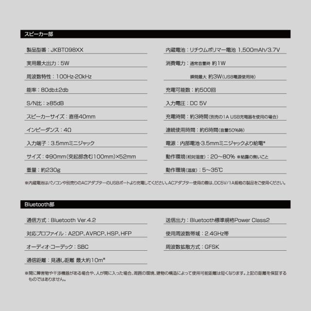 ・実用最大出力:5W ・周波数特性:100Hz-20kHz ・能率:80db±2db ・S/N比:?85dB ・スピーカーサイズ:直径40mm ・インピーダンス:4Ω ・入力端子:3.5mmミニジャック ・内蔵電池:リチウムポリマー電池 1,500mAh、3.7V ・消費電力:通常音量時約1W / 瞬間最大約3W(USB電源使用時) ・充電可能数:約500回 ・入力電圧:DC 5V ・充電時間:約3時間(別売の1AUSB充電器を使用の場合) ※充電にはUSBポートから充電できる充電器/パソコンが別途必要です。 ・連続使用時間;約6時間(音量50%時) ・電源;内部電池 / 3.5mmミニジャックより給電 ・動作環境(相対湿度20〜80% ※結露の無いこと |