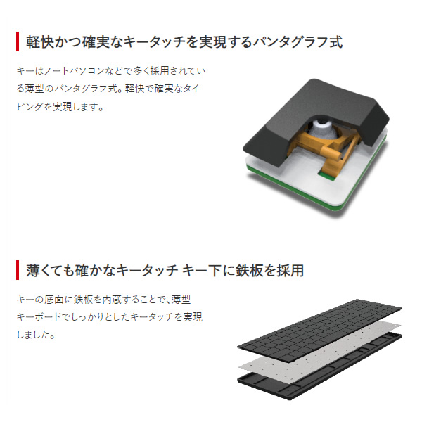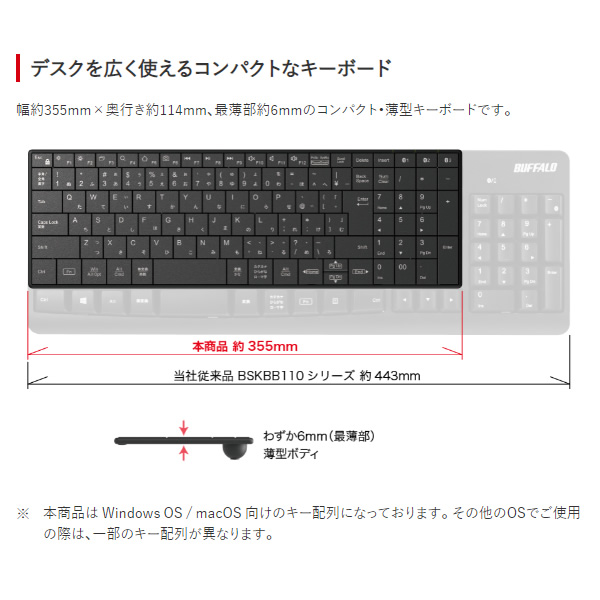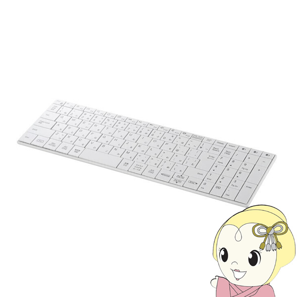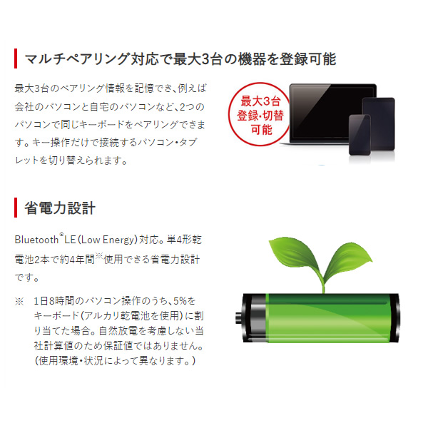 デスクを広く使えるコンパクトなキーボード ■対応OS:Windows、Mac、Chrome OS、iOS、iPad OS、Android ■インターフェース:Bluetooth5.0 class2 ■電波周波数:2.4GHz帯 ■電波到達距離:非磁性体(木の机など)約10m、磁性体(鉄の机など)約3m ■プロファイル:HOGP(HID over GATT Profile) ■キー数:106キー ■キー構造:パンタグラフ ■キーピッチ:19mm ■キーストローク:1mm ■動作時間:想定使用可能時間:1,598日 ■電源:単4形アルカリ乾電池、単4形マンガン乾電池、単4形ニッケル水素充電池のいずれか2本 ■外形寸法(幅×高さ×奥行):約355mm×約19mm×約114mm ■質量:約510g(電池含まず) ■動作保証環境 結露なきこと:温度5℃〜40℃、湿度10%〜85% ■付属品:本体、単4乾電池(2本)、取扱説明書/保証書 ※付属の電池は動作確認用のため、電池寿命が短い場合があります。 ※記載は商品仕様の一部です。仕様説明不足等の理由での返品はできません。特に適合等は必ずご確認ください。