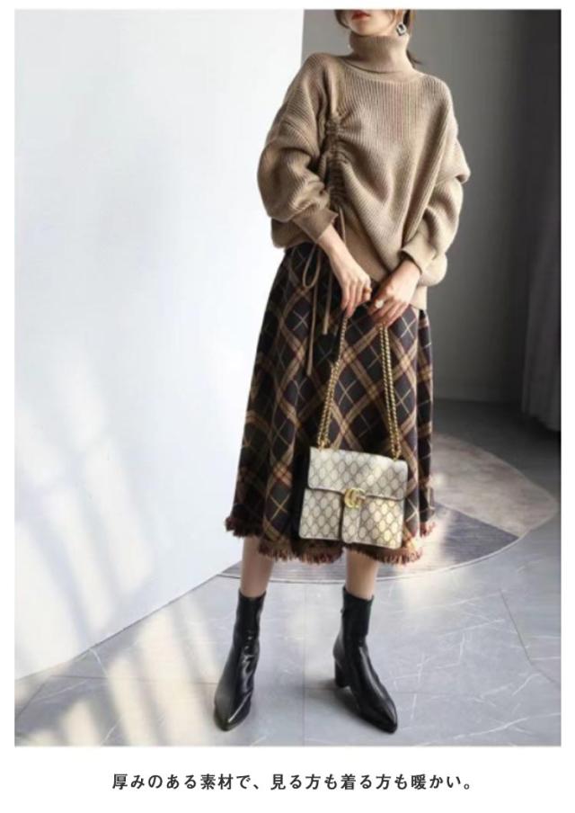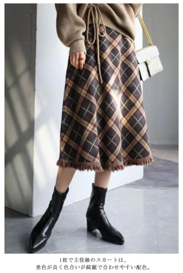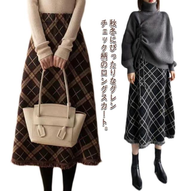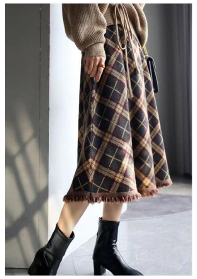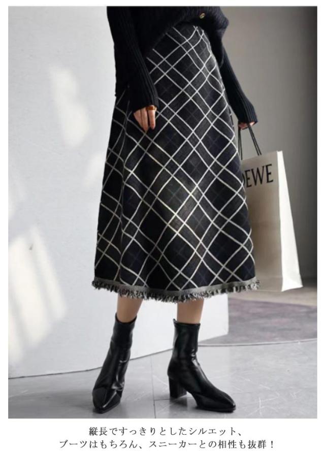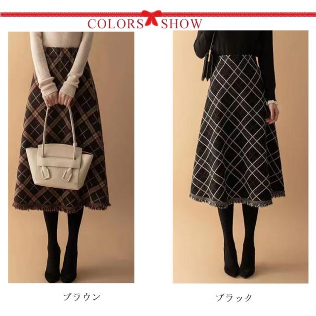 送料無料 スカート チェックスカート ボトムス ひざ丈 Aライン レトロ風 チェック柄 フリンジ 厚手 ロングスカート 秋冬 フレアスカート ハイウエスト ひざ下 ミモレ丈 通勤 通学 フォーマル ストレッチ