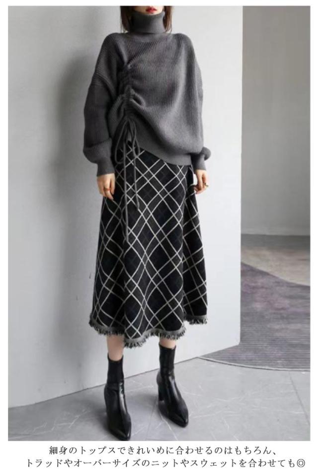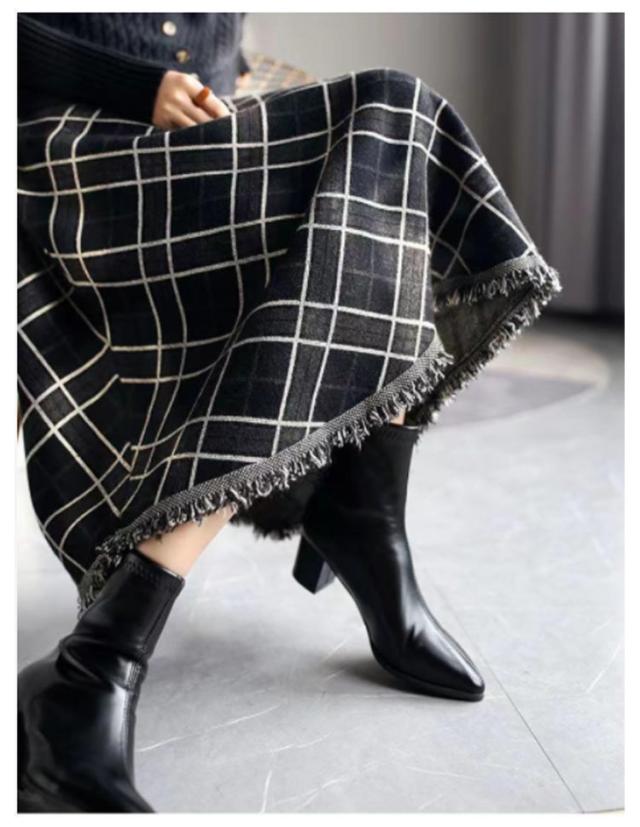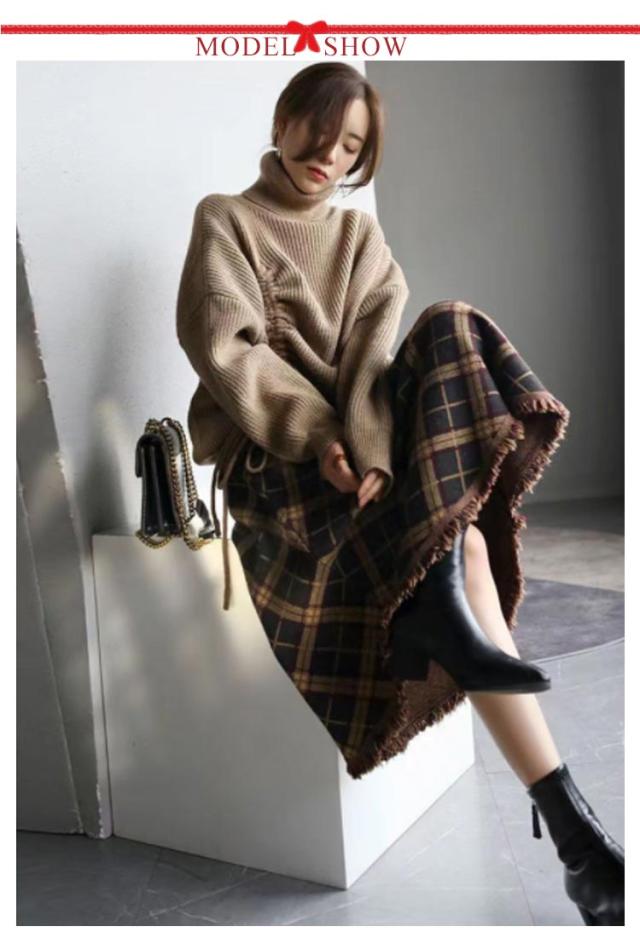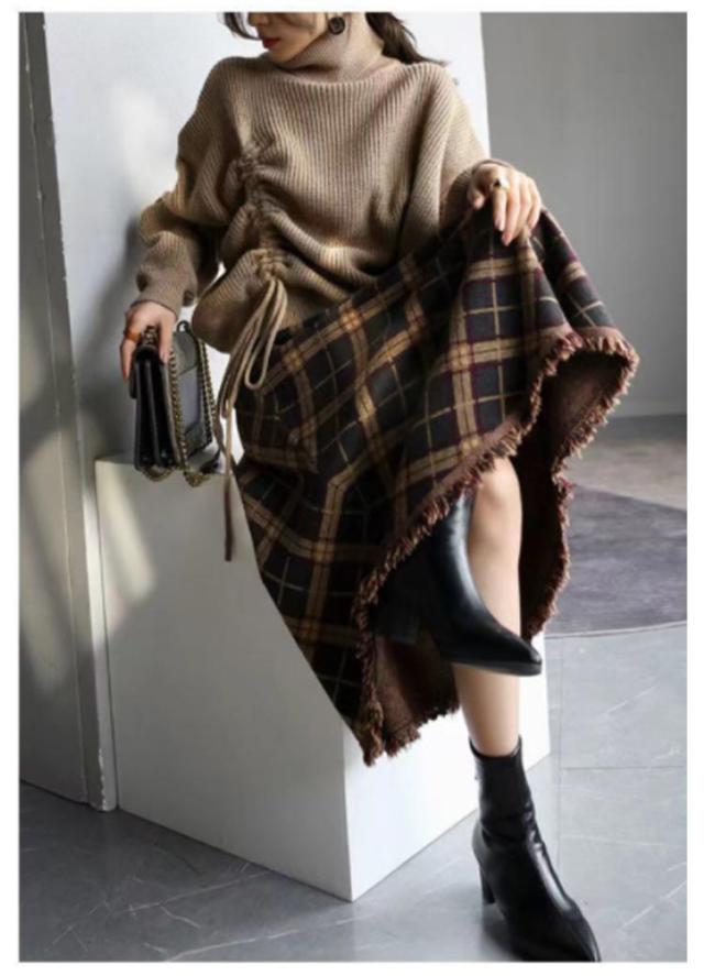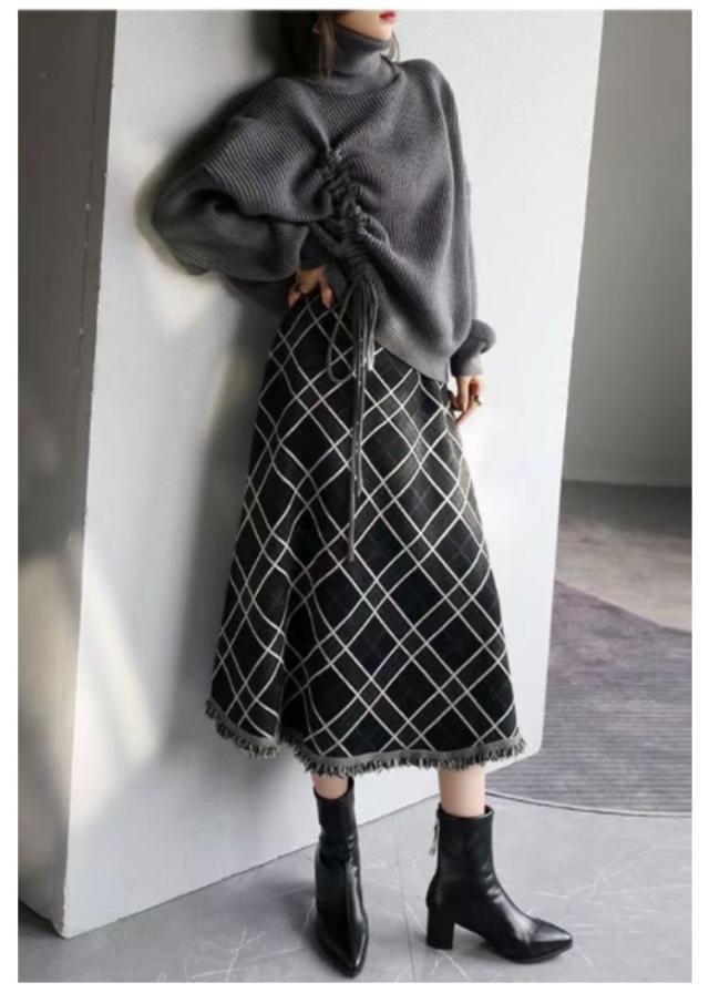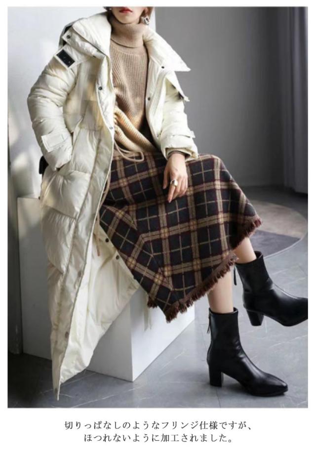 送料無料 スカート チェックスカート ボトムス ひざ丈 Aライン レトロ風 チェック柄 フリンジ 厚手 ロングスカート 秋冬 フレアスカート ハイウエスト ひざ下 ミモレ丈 通勤 通学 フォーマル ストレッチ