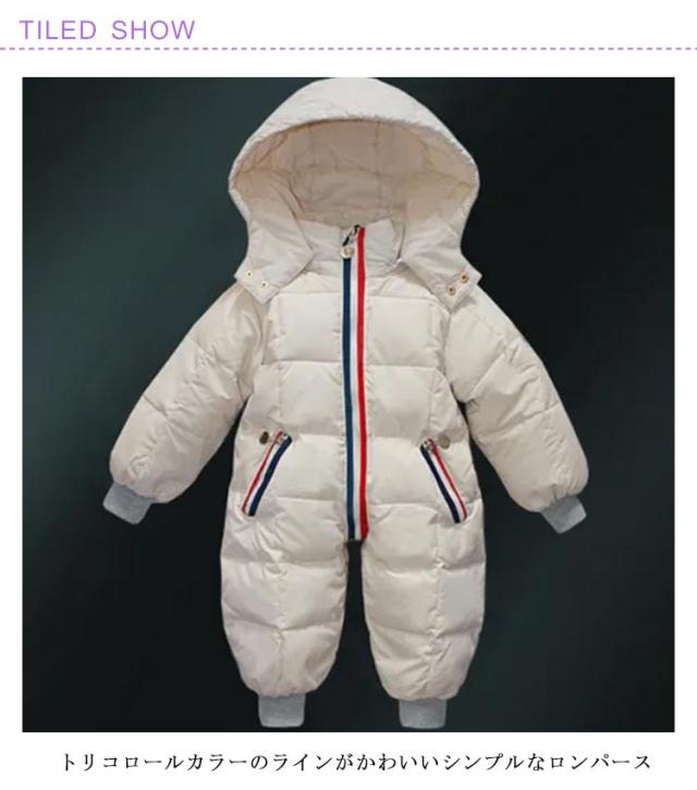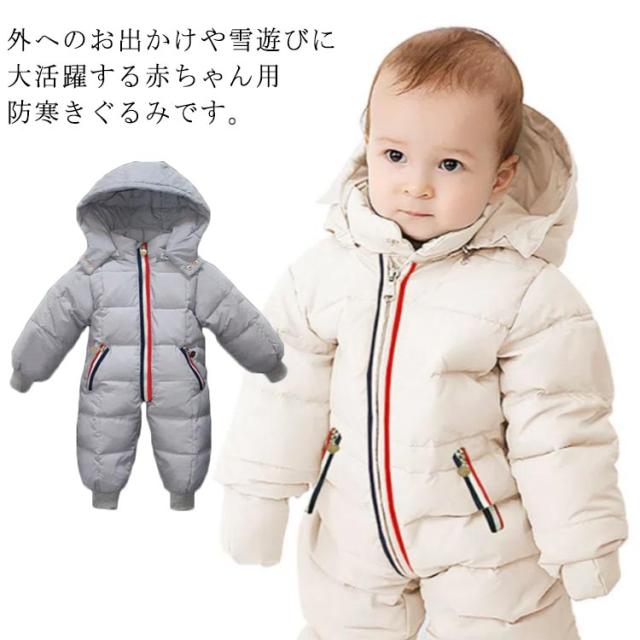 | 外へのお出かけや雪遊びに大活躍する赤ちゃん用防寒きぐるみです。 トリコロールカラーのラインがかわいいシンプルなロンパース 90%ダウン素材で寒い冬でもあったかです。 外出や雪遊びにピッタリのロンパース! 取り外し可能なフード、手袋、足カバー付きで安心です。 寒い日のお出かけや、ベビーカーでのお散歩にも◎ | |