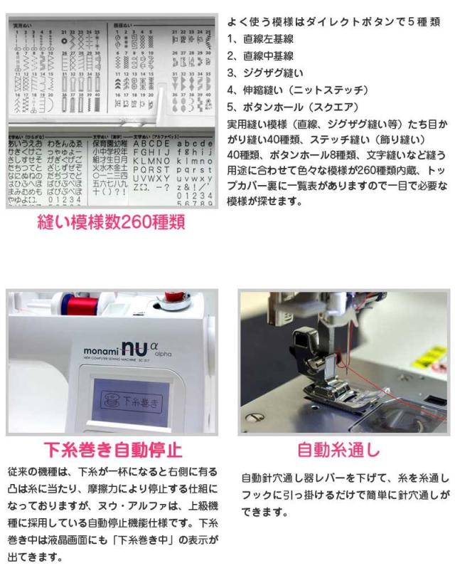 自動糸調子仕様、液晶模様表示仕様、縫い模様数260種類、文字縫いステッチ縫い機能、ニュースレッティッグシステム、下糸巻き自動停止機能、自動針穴通し(自動糸通し)、自動糸切り機能(オートカッター)、自動糸止め縫い機能(ほつれ止め)、光る手元スタート/ストップボタン、ワンタッチスローボタン、自動ボタンホール(アンダープレート付き、自動穴かがり縫い)、7枚送り歯、貫通力(縫うパワー)、LEDランプ、オール金属製針板、広いソーイングスペース、ハードケース付属(硬質収納ケース)、電源コード巻き込み式、静音設計、ワイドテーブルサービス、フットコントローラーサービス、付属品一式