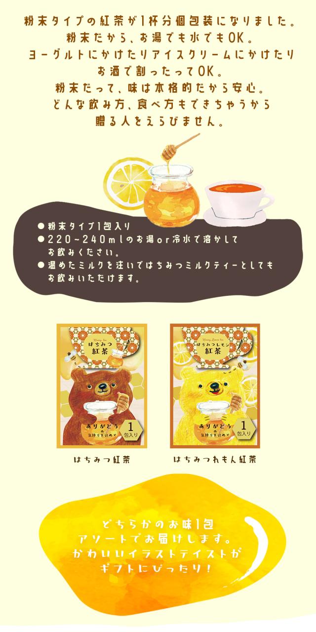 はちみつ紅茶1包とはちみつレモン紅茶1包の2つの味どちらかをアソートで。