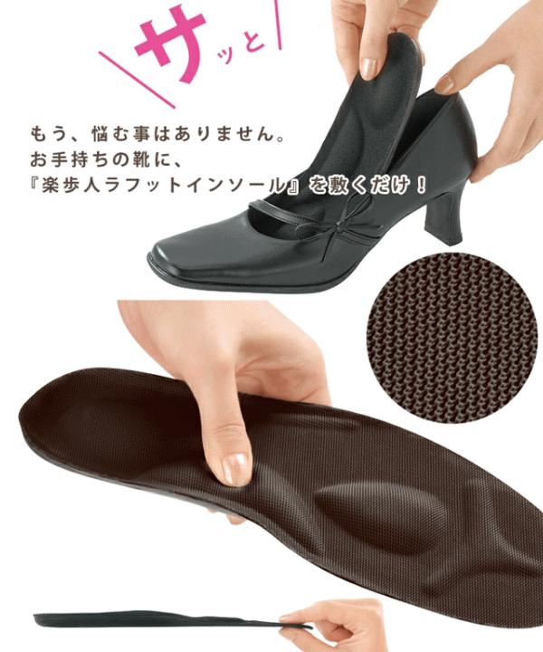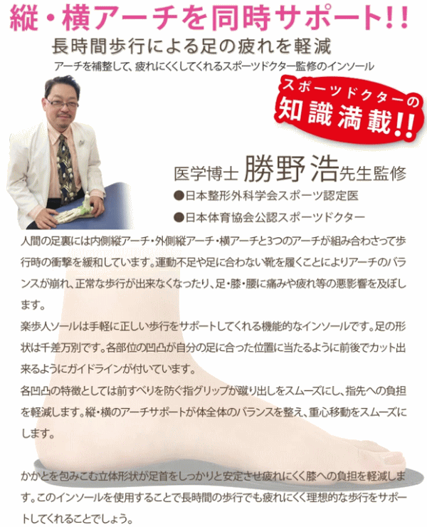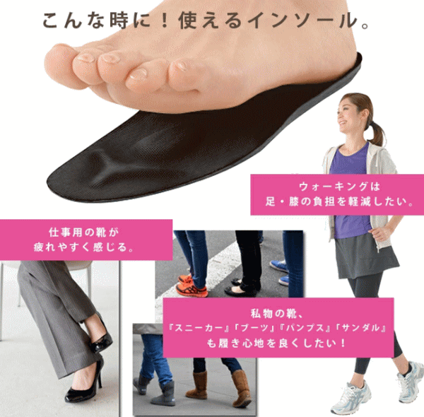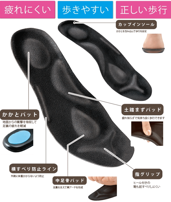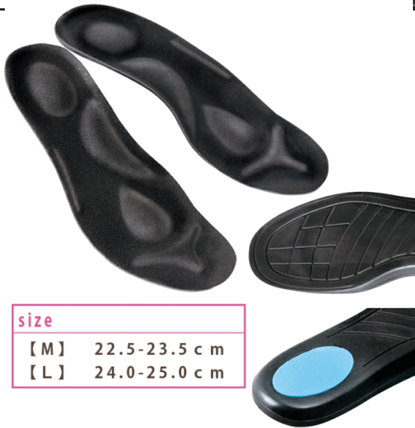 足のお悩みや正しい歩行を熟知したスポーツドクター監修インソール!足をしっかりサポートして長時間歩いても疲れにくい履き心地を追求しました。中足骨と土ふまずパッドが縦・横アーチをしっかり整えて疲れにくく気持ちの良い理想的な歩行をサポートします。こだわりの突起配置+カットラインでオーダーメイドの付け心地。カットラインにより足に合わせたサイズ調整が可能!ソール裏の滑り止め設計で靴の中のズレを防止します。ブーツやパンプスなど様々な靴でご使用頂けます。ベージュとブラックの2色展開。■サイズ[M]22.5〜23.5cm[L]24〜25cm■材質[生地]ポリエステル[合成底]ポリウレタン■生産国:日本製■カラー:ブラック、ベージュ■サイズ:M、L【ネコポスでのお届けとなります】送料無料ですが代引き発送はできません。発送後一部地域を除き2〜3日で投函となります。ネコポスには配達保証がありません。宅配便での発送をご希望の場合は店舗指定の送料770円が別途掛かります。その際はご注文時にご入力お願い致します。ご注文数によっては宅配便で発送させて頂く場合があります。他商品との同梱及び代引き発送、配達日時指定はできません。