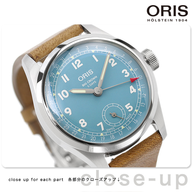 正規品 10年保証キャンペーン オリス ビッグクラウン キャリバー473 スイス製 手巻き メンズ 腕時計 01 473 7786 4065-07 5 19 22FC ORIS BIG CROWN アナログ ブルー オリーブブラウン ◆ORIS(オリス)は、ポール・カッティン氏とジョージ・クリスチャン氏の2人によってスイスのヘルシュタインで創設されました。近くを流れる小川にちなんで社名をオリスと命名。手頃な価格ながら、革新的で高機能かつ実用的な機能を備えた本格機械式時計で知られています。 オリスと航空を結びつけたビッククラウンは、1938年誕生以来パイロットウォッチの原型になったコレクション。オリスのシグネチャーモデルが、高性能の自社開発手巻きムーブメントを搭載して再登場。4年の歳月をかけて開発した手巻きムーブメントを搭載したビッグクラウンキャリバー473です。裏蓋を覗くと、シンプルで実用的な120時間パワーリザーブゲージがセットされており、巻き上げのタイミングを確認できます。 発売日:23年01月発売 機械式腕時計