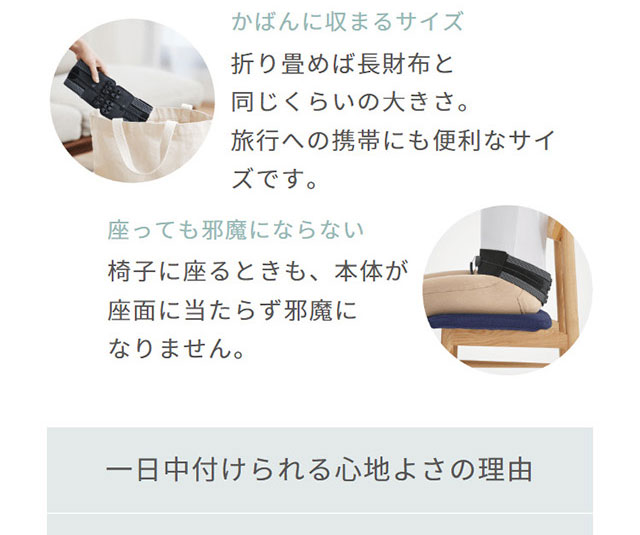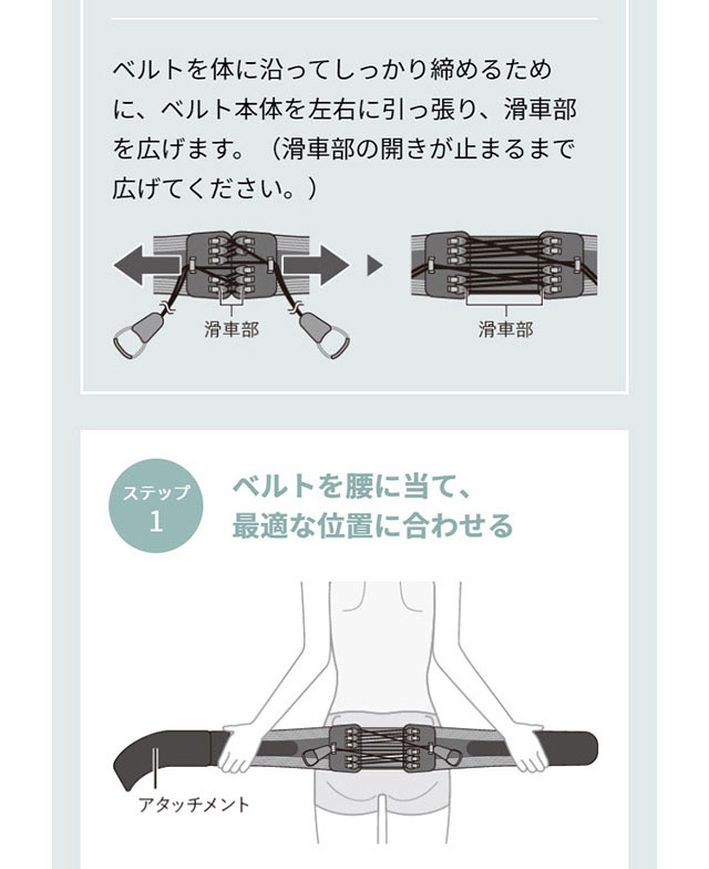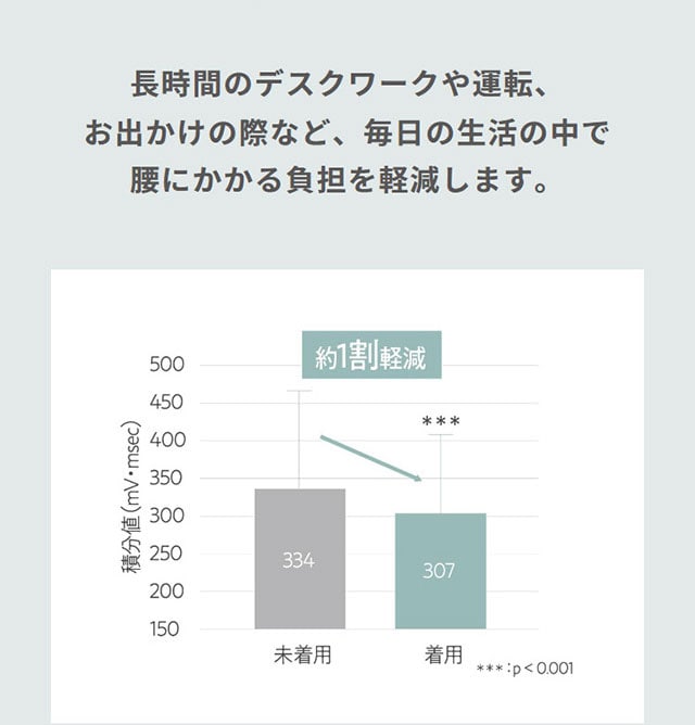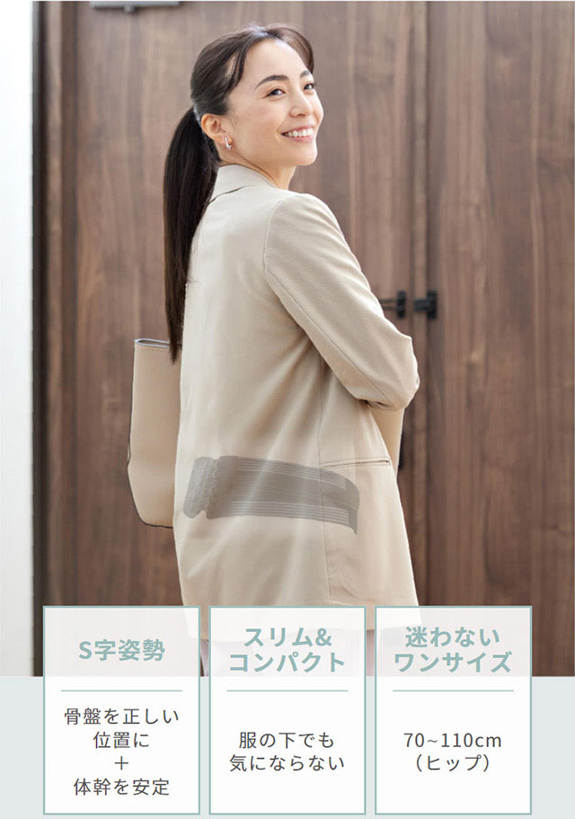 - 思った以上に軽い力でしっかり締まり腰をサポートしてくれます。服の下に装着していても薄いのでめだたず長時間着用していても快適です。