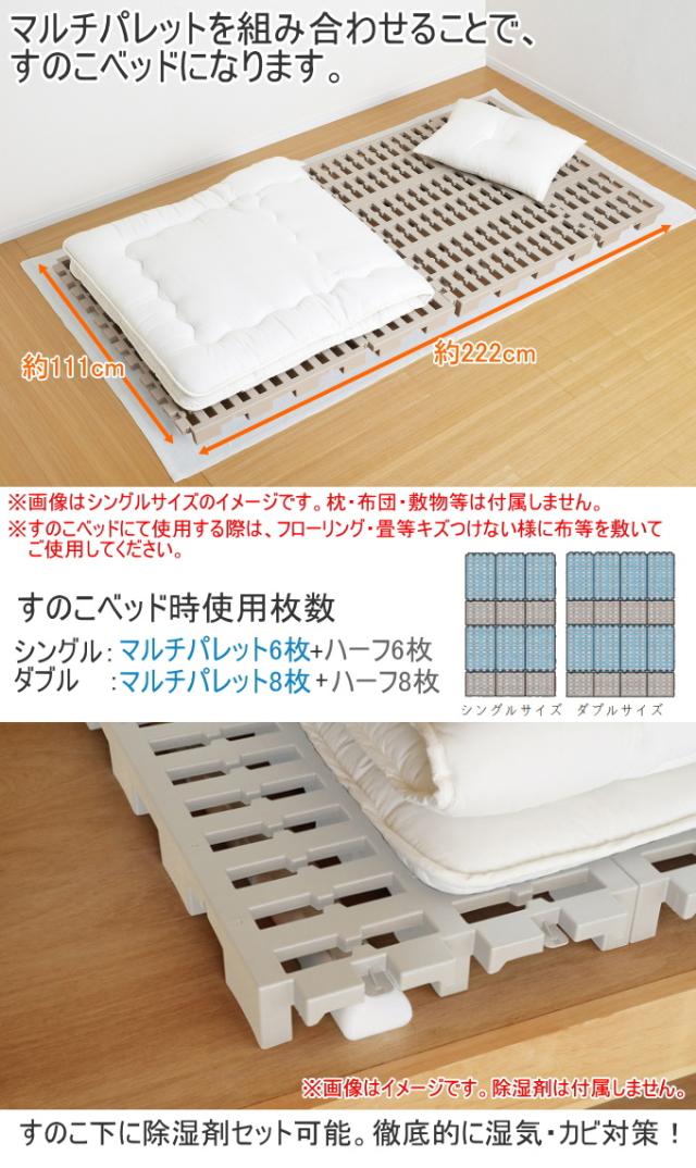湿気・カビから守り通気性バツグン!! プラスチック製すのこ。 木製と違って製品本体にカビが生えることがありません。 軽量なので移動もラクラク! 並べて手軽に連結できます。 組み合わせれば棚としても使用可能です。 (商品ページの画像をご確認ください。) 同シリーズのハーフサイズを組み合わせるとすのこベッドになります。 足高なので(床から約5cm)隙間モップで手軽にお掃除ができます。 ■マルチパレット ハーフサイズはこちら↓ マルチパレット ハーフサイズ ■マルチパレット シングルサイズセットはこちら↓ マルチパレット シングルサイズセット ■マルチパレット ダブルサイズセットはこちら↓ マルチパレット ダブルサイズセット |