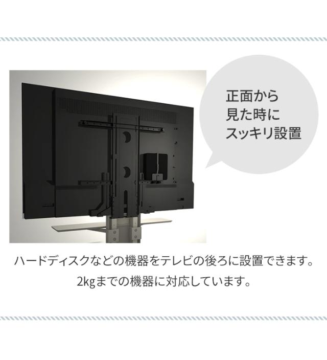| 正面から見た時にスッキリ設置。 ハードディスクなどの機器をテレビの後ろに設置できます。 2kgまでの機器に対応しています。 |