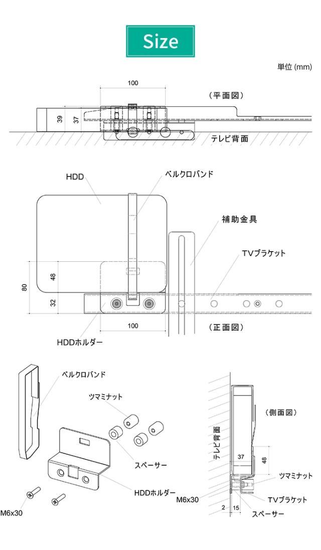 ハードディスクなどの機器をテレビの後ろに設置できます。