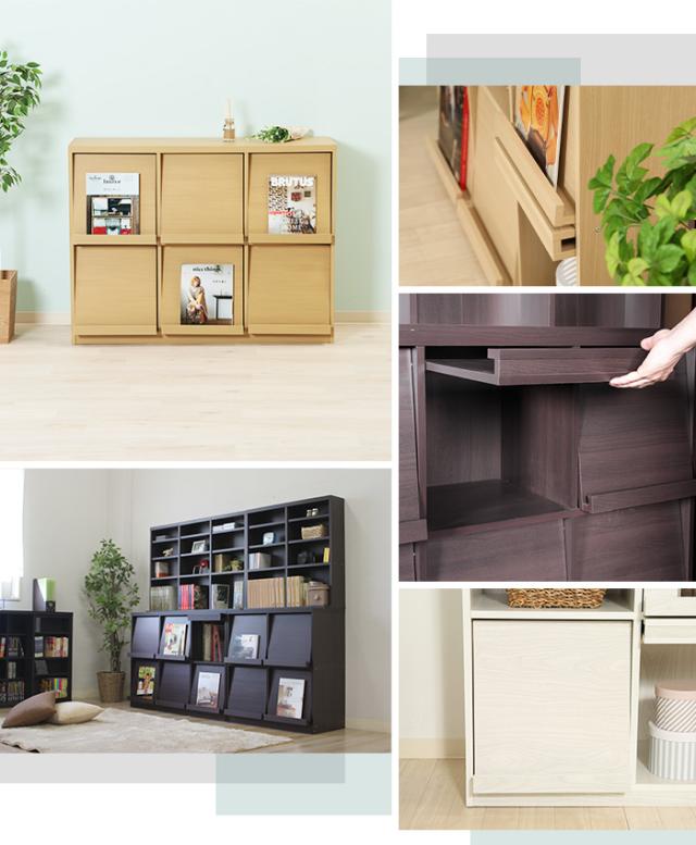 | フラップ扉がおしゃれなディスプレイラックです。 扉部分にお気に入りの雑誌などをディスプレイすることができます。 扉の中は収納スペースとなっており、隠す収納として使用できます。 ディスプレイしたままでも扉は開くことができます。 |