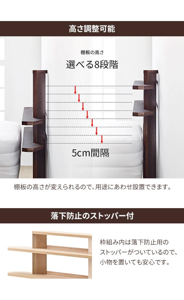| ヘッドボードのないベッドにちょい置きスペースをつくれます。 棚板の高さが変えられるので、用途にあわせ設置できオープンスタイルで圧迫感のない仕様です。 枠組み内は落下防止用のストッパーがついています。 |