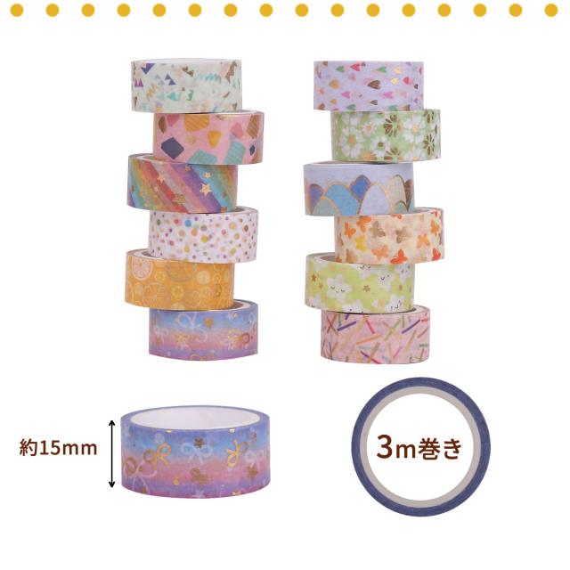 マスキングテープ 12巻セット マステ キラキラ バラエティ 15mm×3m ハート 花 星 レモン 蝶々 ドット 可愛い かわいい 手帳 手紙 和紙 ラッピング 装飾 デコ 写真 プレゼント diy ハンドメイド デザイン カード 送料無料 yp rm