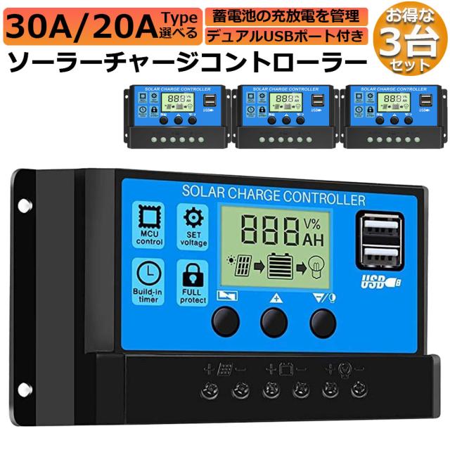ソーラーチャージ コントローラー 3台セット 20A 30A 12V 24V 鉛蓄電池車バッテリー充電コントローラー USBポート 付き LCD液晶表示 ソーラーパネル 太陽光パネル 接続用 過充電 過負荷 防止保護