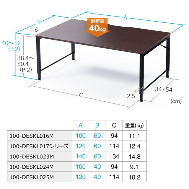 ●横幅100cm、奥行60cmのシンプルなローデスクです。●高さ調整は約40cm、約43cm、約46cm、約49cm、約52cmの5段階で調整できます。