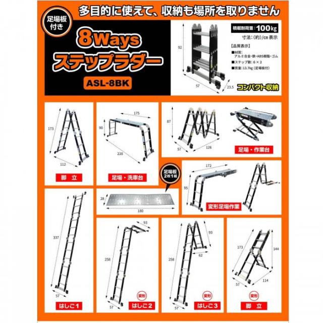 万能はしご兼用脚立8WAYSステップラダー ASL-8BK アルミス