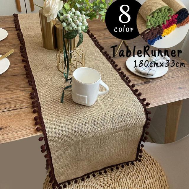 テーブルランナー テーブルセンター センタークロス テーブルクロス 長方形 リネンテイスト 麻テイスト 180cm ボンボン付き