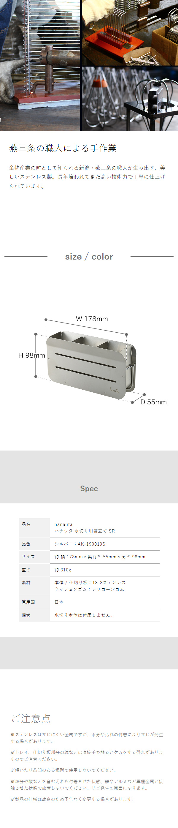燕三条製のステンレス箸立て。「hanauta 水切りラック」にセットでき、カトラリースタンドとして単体でも使用OK。3分割できる仕切り付きで、底面に取り付けるシリコンの滑り止めも付属。