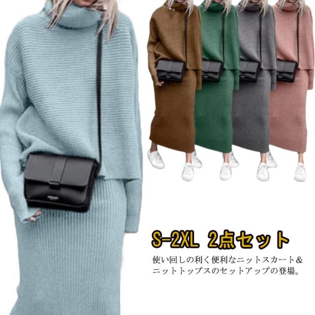 【送料無料】ニット セットアップ レディース ニットスカート タイトスカート ニットセーター 長袖 タートルネック リブニット プルオーバー 2点セット 春 秋 服 通勤 無地 シンプル カジュアル 大きいサイズ S M L XL 2XL