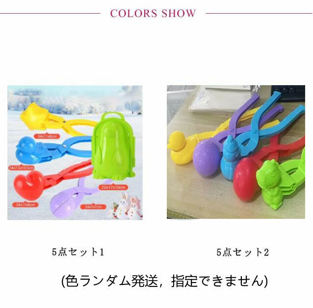 | 5点セット!子供でも雪玉やペンギン、あひる、星、スノーマンなどが簡単に作れるスノーボールメーカー。 雪をすくってちょっと挟むだけで、サクサク雪玉が作れます。 真ん丸だけでなく、ペンギンや星やハート型などたくさんの種類があります。 お子さんの手にも持ちやすいサイズで、1つあると便利です。 | |