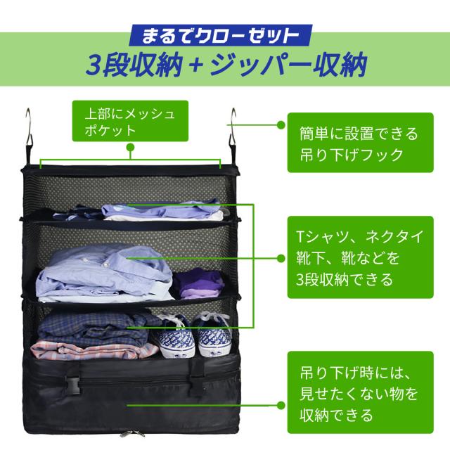 【3段収納+ジッパー収納】シャツ、ネクタイ、靴下、靴などを3段収納できる。吊り下げ時には、見せたくないものを下部の収納スペースにジッパーで収納できる。