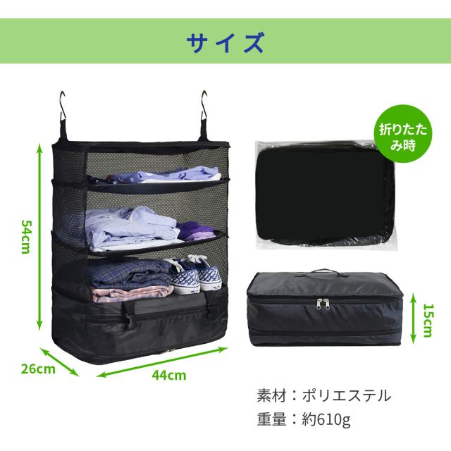 - 迅速丁寧な対応ありがとうございました。 旅行先のクローゼットに掛けて使用しましたが、服が取り出しやすくて良かったです。収納した時は、コンパクトになり、持ち手があるので持ち運びも楽でした。