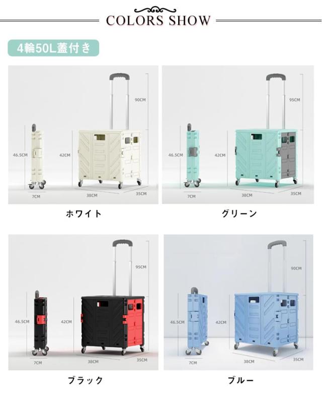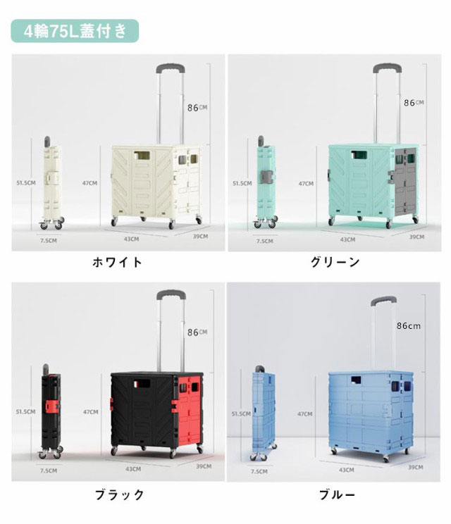 | 50/75L大容量!耐荷重抜群の折りたたみショッピングカート 選べる容量サイズ、一度に多くの貨物を運ぶことができるという要件を満たし、時間と体力を節約しことができます。 人間工学に基づいて、キャリーカートは段階調整可能ことができます。 使用しない時はコンパクトに折りたたむことができます。最短5秒で簡単に折り畳んで、隙間でも簡単に収納できます。家の中に収納する時は邪魔になりません。 女性でも扱いやすいシンプルな組み立て方法です。後片付けも容易でお買い物などお気軽にご使用いただけます。 お買い物だけではなく釣りやキャンプ、運動会などアウトドアでも使用できるタフな作り。フタ付きなので、座って休憩したり、アウトドアの際のテーブルになったり、このフタの上に荷物を置くことでさらに多くの荷物を運搬することもできとても便利です。 | |