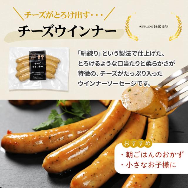 「絹練り」という製法で仕上げたとろけるような口当たりと柔らかさが特徴のチーズがたっぷり入ったウインナーソーセージです
