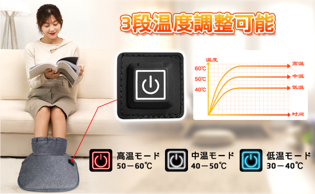 【3段階調節可能】フットウォーマー の表面に温度調整ボタンがあり、長押しで電源を入れて、短押しで温度モードを切り替えます。高温モード:ボタンは赤い光、温度は約60℃。中温モード:ボタンは白い光、温度は約50℃。低温モード:ボタンが青い光、温度は約40℃。気温や自身ニーズに応じて調整できる、とても便利です。