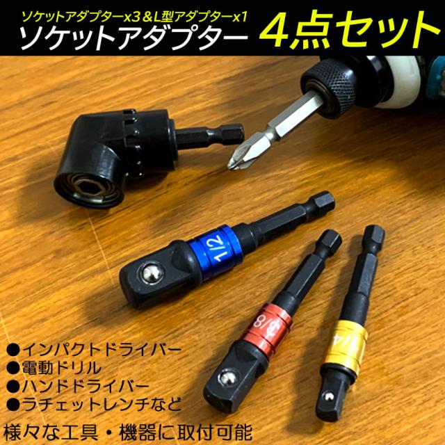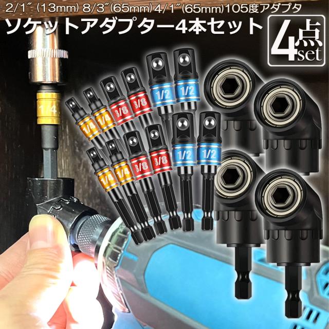 ソケット アダプタ 4セット L型 六角シャンク 1/4 3/8 1/2 ドリルアダプター ソケットアダプター 105度 直角ドリルビット 延長ドリルビット 磁気ビットソケット ビット ソケット インパクト DIY 工具 便利グッズ 送料無料