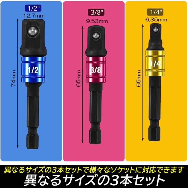 【差込角】 : 6.35(1/4)・9.5(3/8)・12.7(1/2)mmのサイズに対応しています。この3つを持っていれば、どのソケットサイズでも対応できるので便利です。日曜大工で使用するには、便利なツールです。