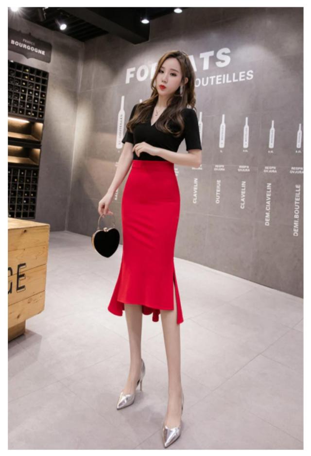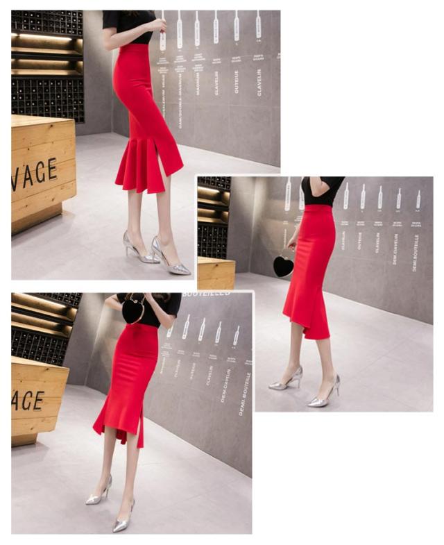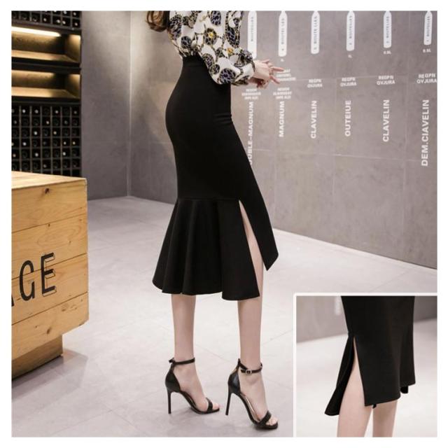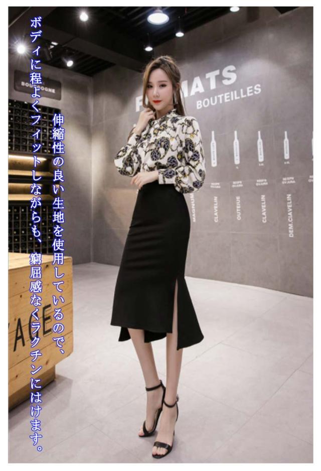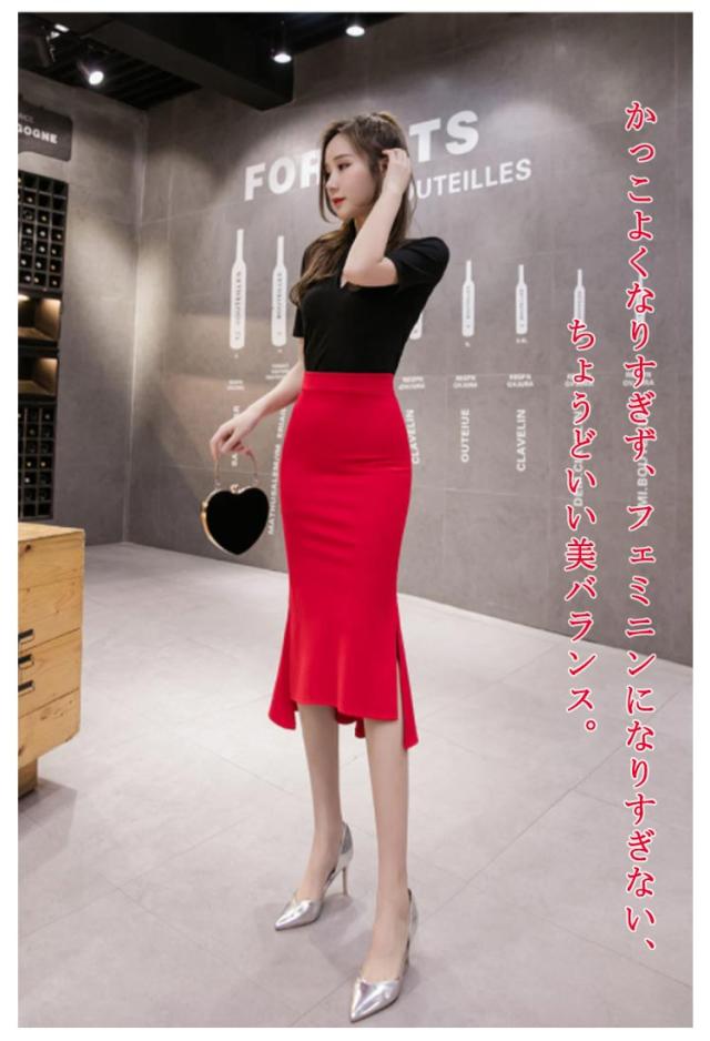 サイドスリット マーメイドスカート ハイウエスト ミモレ丈 らくちん オフィス ヘムライン タイトスカート 体型カバー 伸縮性 美シルエット スタイルアップ フリルヘム ボトムス 細見え ストレッチ 膝丈 通勤 OL 仕事 送料無料