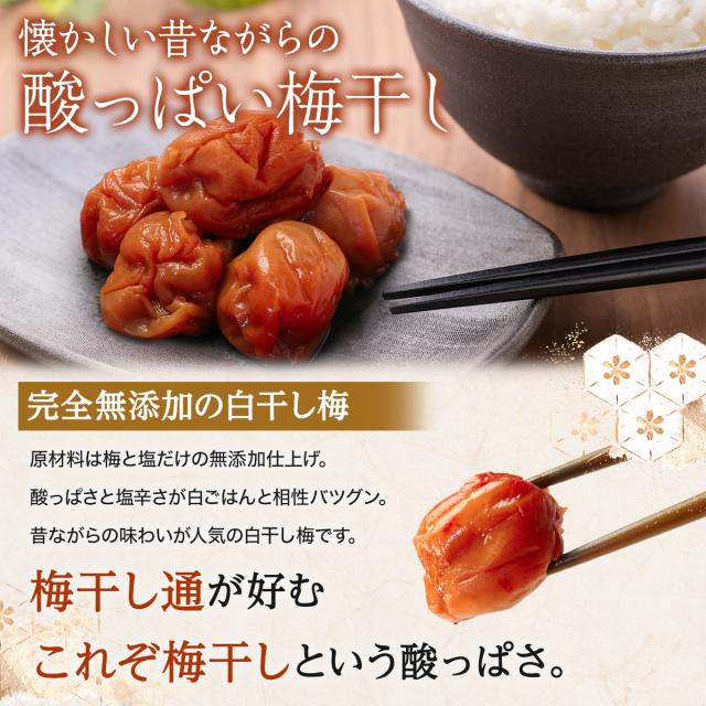 【完全無添加 完熟南高梅 梅干し】高級紀州南高梅の白干し梅は、余計なものを一切使わずに、塩のみでじっくり漬け込むことで、昔ながらのすっぱい味に仕上げた訳あり梅干しです。