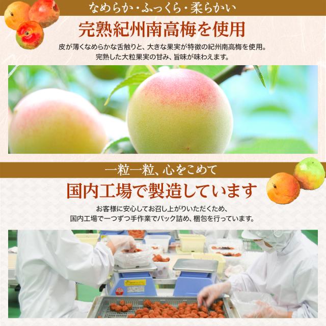 【国内工場で製造 完熟南高梅】皮が薄くなめらかな舌触りと、大きな果実が特徴の和歌山県産の紀州南高梅を使用。一粒一粒、心をこめて、国内工場で手作業でパック詰め、梱包を行っています。