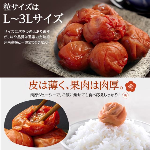 【大粒L〜3Lサイズを使用】そのままでもお料理に使いやすいサイズの紀州南高梅です。皮は薄く、果肉は肉厚。肉厚ジューシーでご飯に乗せても食べ応えしっかり!また、おにぎりやお茶漬け、パスタなどさまざまなお料理にもお使いいただけます。