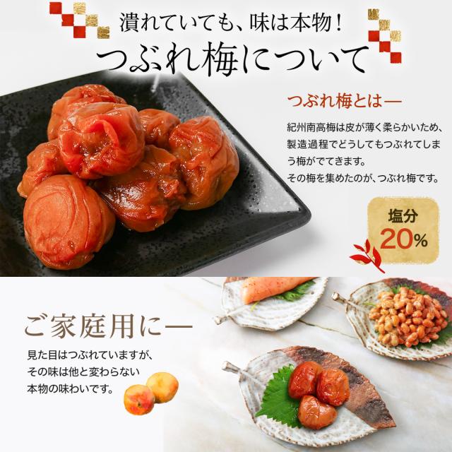 つぶれ梅とは紀州南高梅は皮が薄く柔らかいため、製造過程でどうしても若干つぶれてしまう訳ありの梅のこと。ただ、その味は他と変わらない本物の味わい。甘いうめぼしが苦手な方や調味液を使わない梅干をお探しの方におすすめです。ギフトや贈答、プレゼントや贈り物に最適です。