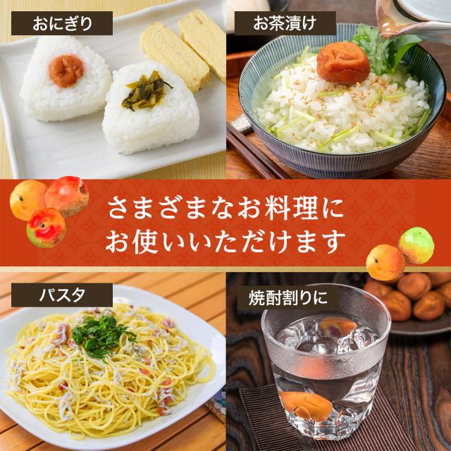 そのままでもお料理に使いやすいサイズの紀州南高梅です。皮は薄く、果肉は肉厚。肉厚ジューシーでご飯に乗せても食べ応えしっかり!また、おにぎりやお茶漬け、パスタなどさまざまなお料理にもお使いいただけます。